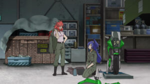 0:04 – Tsubasa is working on her bike and humming Gyakkou no Flugel