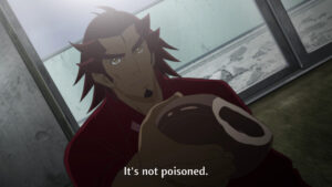 Genjuro demonstrating to Chris that the food he brought her is not poisoned by eating and drinking a bit of it before he hands it over to her. Chris has spent the last several years of her life being abused by the adults around her. Genjuro is taking it one small step at a time to gain Chris’ trust.